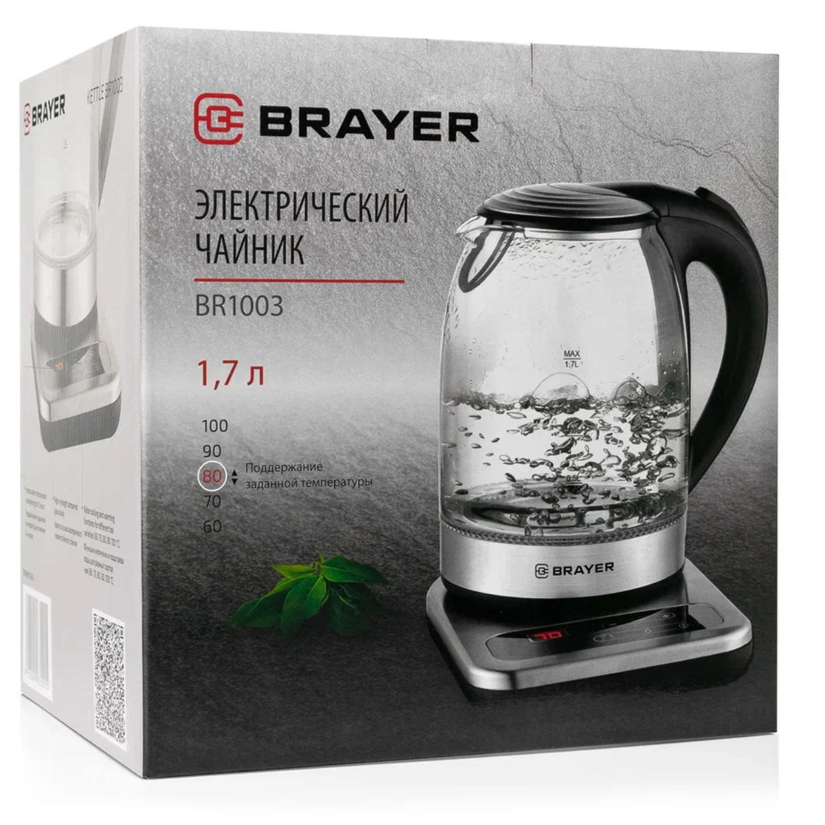 Чайник эл. BRAYER BR1003, 1.7л, стекло, 2200Вт, выбор темп. 40/60/70/80/90/100, поддержка температуры, фильтр, подсветка, черный