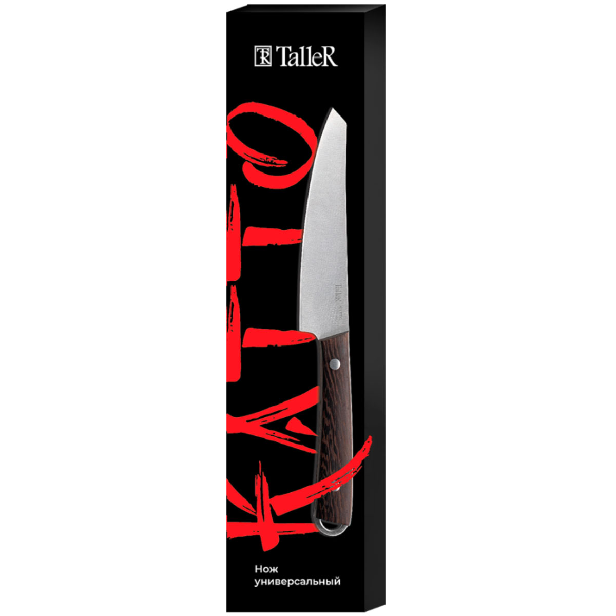 Нож универсальный TalleR TR-22056 из серии Катто — практичный и многофункциональный инструмент для нарезки овощей, фруктов, колбасы, сыра, масла и других продуктов. Длина лезвия 12,5 см при толщине 1,6 мм обеспечивает тонкий и точный рез.Лезвие изготовлено из высококачественной нержавеющей стали AISI 420S45, что гарантирует устойчивость к коррозии и долговечность. Рукоять сочетает нержавеющую сталь и дерево венге, создавая стильный и эргономичный дизайн. Наличие отверстия для подвешивания добавляет удобство в хранении.