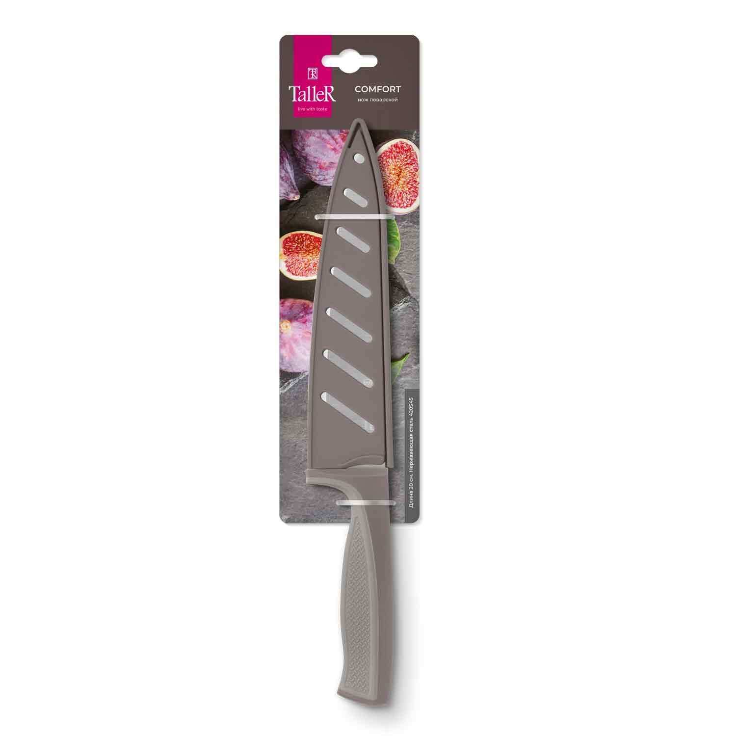 Нож поварской TalleR TR-22032 из серии Комфорт — универсальный помощник на вашей кухне для нарезки, шинковки и измельчения самых разных продуктов. Лезвие длиной 20 см, шириной 4,5 см и толщиной 1,8 мм изготовлено из высококачественной коррозионностойкой нержавеющей стали AISI 420S45 (3Cr13), что гарантирует долговечность и устойчивость к износу.Рукоять выполнена из ударопрочного пластика с эргономичной силиконовой вставкой светло-коричневого оттенка, обеспечивающей комфортный и надежный хват без риска выскальзывания. В комплект входит практичный чехол из твердого безопасного пластика (PP) в тон рукояти — он позволяет безопасно хранить нож и брать его с собой на пикники, в походы и на дачу.