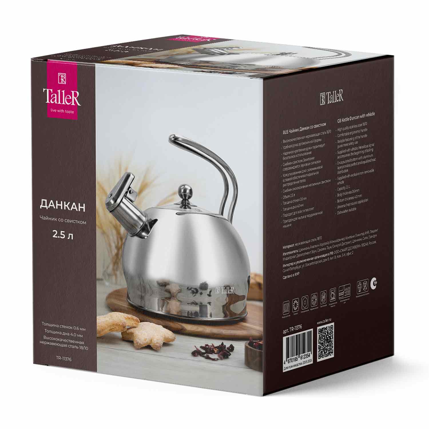 Чайник TalleR TR-11376 "Данкан» — стильный и функциональный выбор для вашей кухни. Изготовлен из высококачественной нержавеющей стали 18/10 с зеркальной полировкой, которая придаёт изделию элегантный блеск и облегчает уход. Объём 2,5 литра оптимален для семьи или небольшого коллектива.