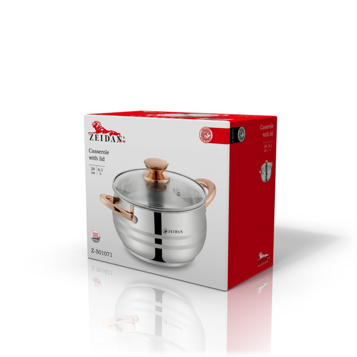 Кастрюля нерж. ZEIDAN Z-501071, 6,1л, 24см, стекл.кр., индукц. дно, ручки под золото, п/у