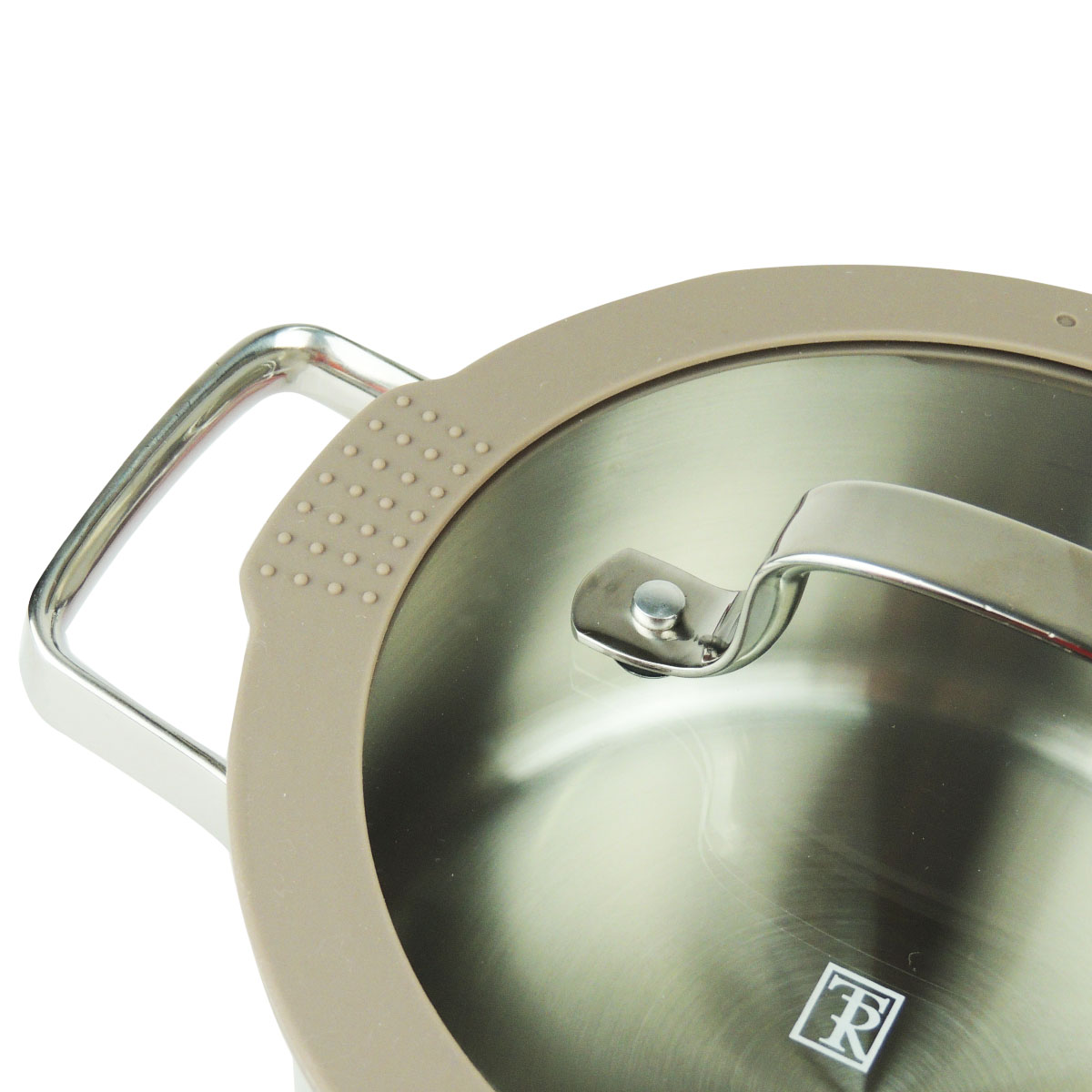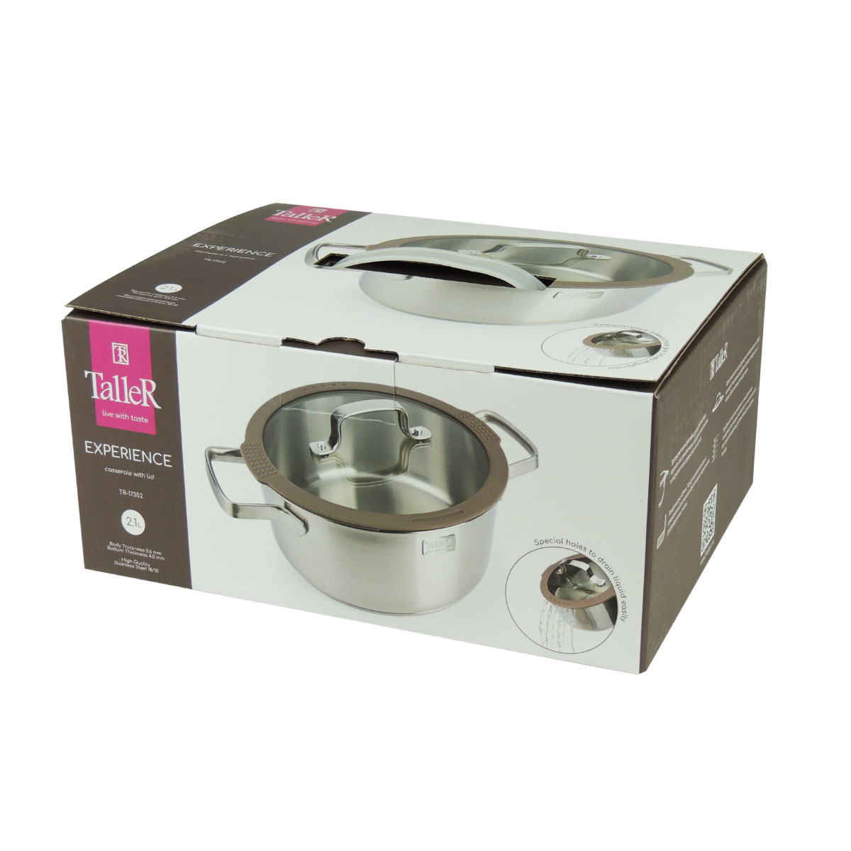 Особенностью модели является комбинированная крышка из закалённого стекла с силиконовым ободом светло-коричневого цвета. Такая конструкция крышки облегчает слив жидкости благодаря специальным отверстиям, позволяет контролировать выход пара и предотвращает появление сколов и царапин, а также бесшумно закрывает посуду. Ручки из нержавеющей стали надежно закреплены точечной сваркой, что повышает надежность и удобство в использовании. Внутри кастрюли нанесены отметки объема для удобства контроля жидкости.
