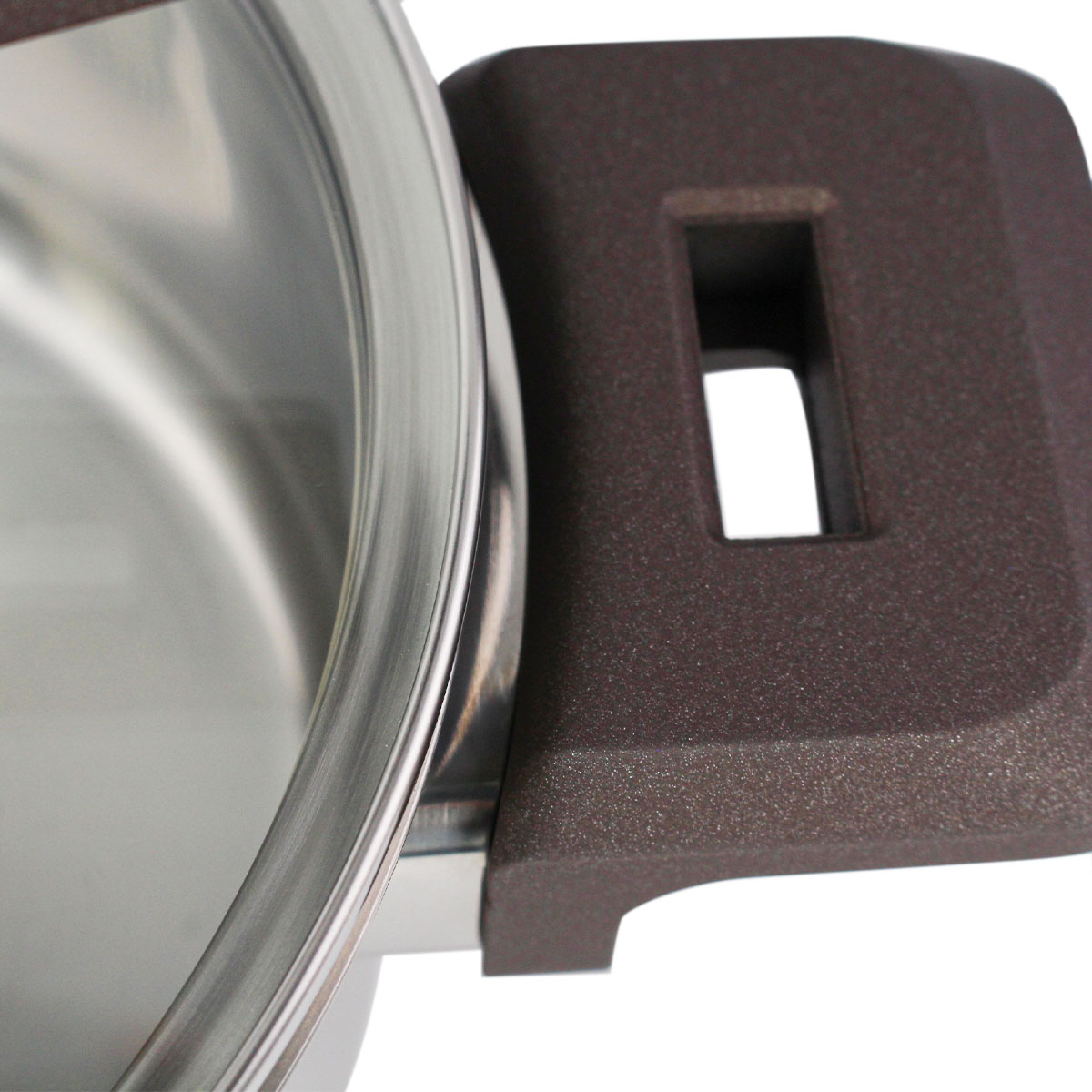 Ручки выполнены из бакелита и нержавеющей стали, надежно крепятся точечной сваркой, окрашены в коричневый цвет. Крышка изготовлена из жаропрочного стекла со стальным ободом, оснащена отверстием для выхода пара. Особая конструкция ручки крышки позволяет удобно устанавливать её на кастрюлю во время приготовления.