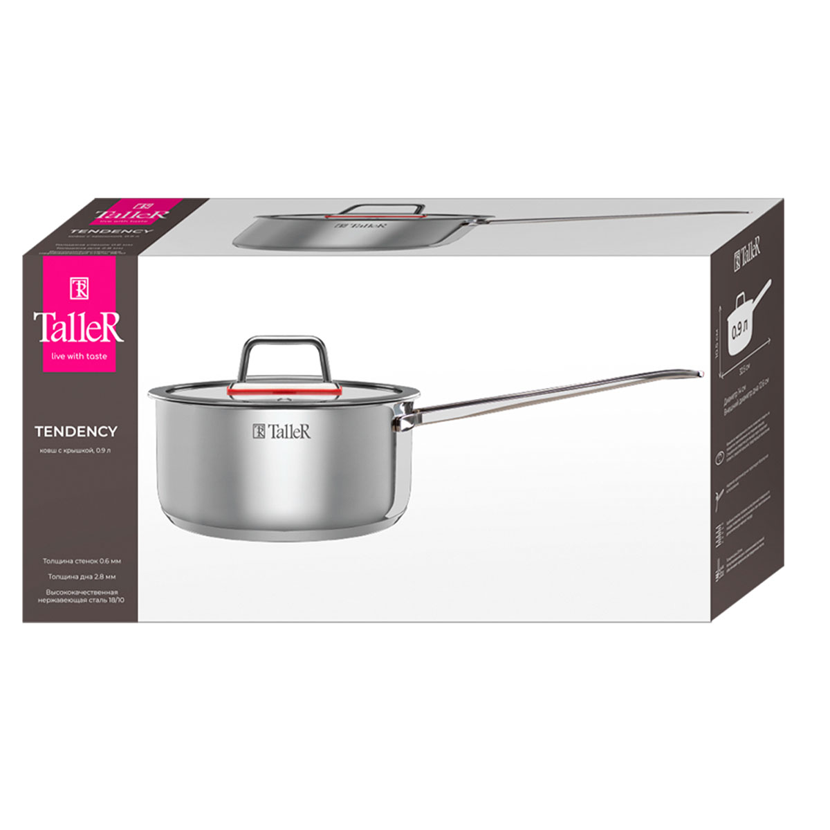 Ковш с крышкой TalleR TR-17271 "Тенденси» объёмом 0,9 л — компактная и функциональная модель из высококачественной нержавеющей стали 18/10 с зеркальной полировкой внутри и снаружи. Капсулированное дно толщиной 2,8 мм обеспечивает равномерное и быстрое распределение тепла, а стенки толщиной 0,6 мм гарантируют надёжность и долговечность.Плоская крышка из жаропрочного стекла с металлическим ободом и отверстием для выхода пара позволяет контролировать процесс приготовления и предотвращает избыточное образование конденсата. Ручка, закреплённая точечной сваркой, обеспечивает прочное и удобное удержание. Внутри ковша есть отметки литража для точного измерения.